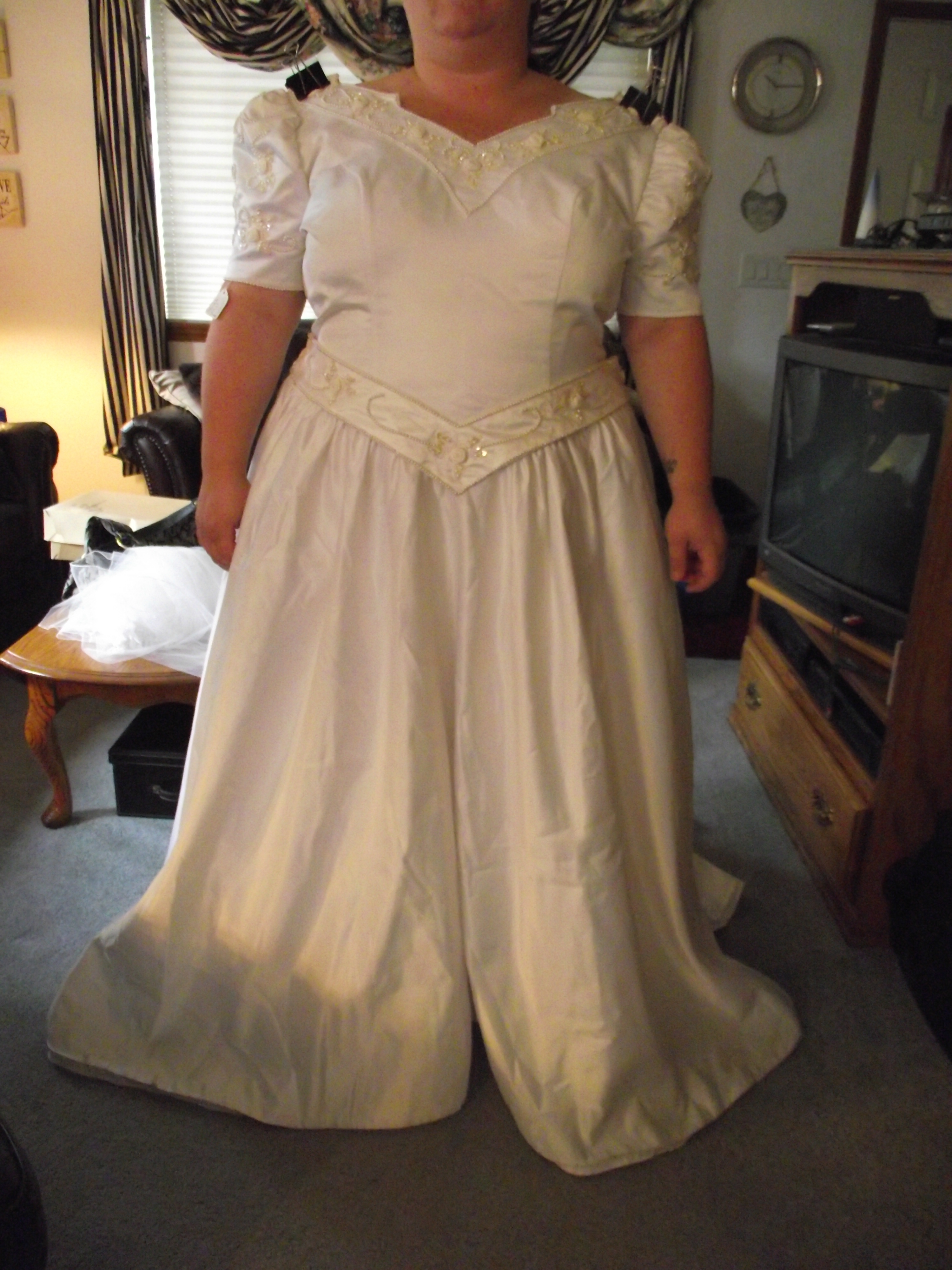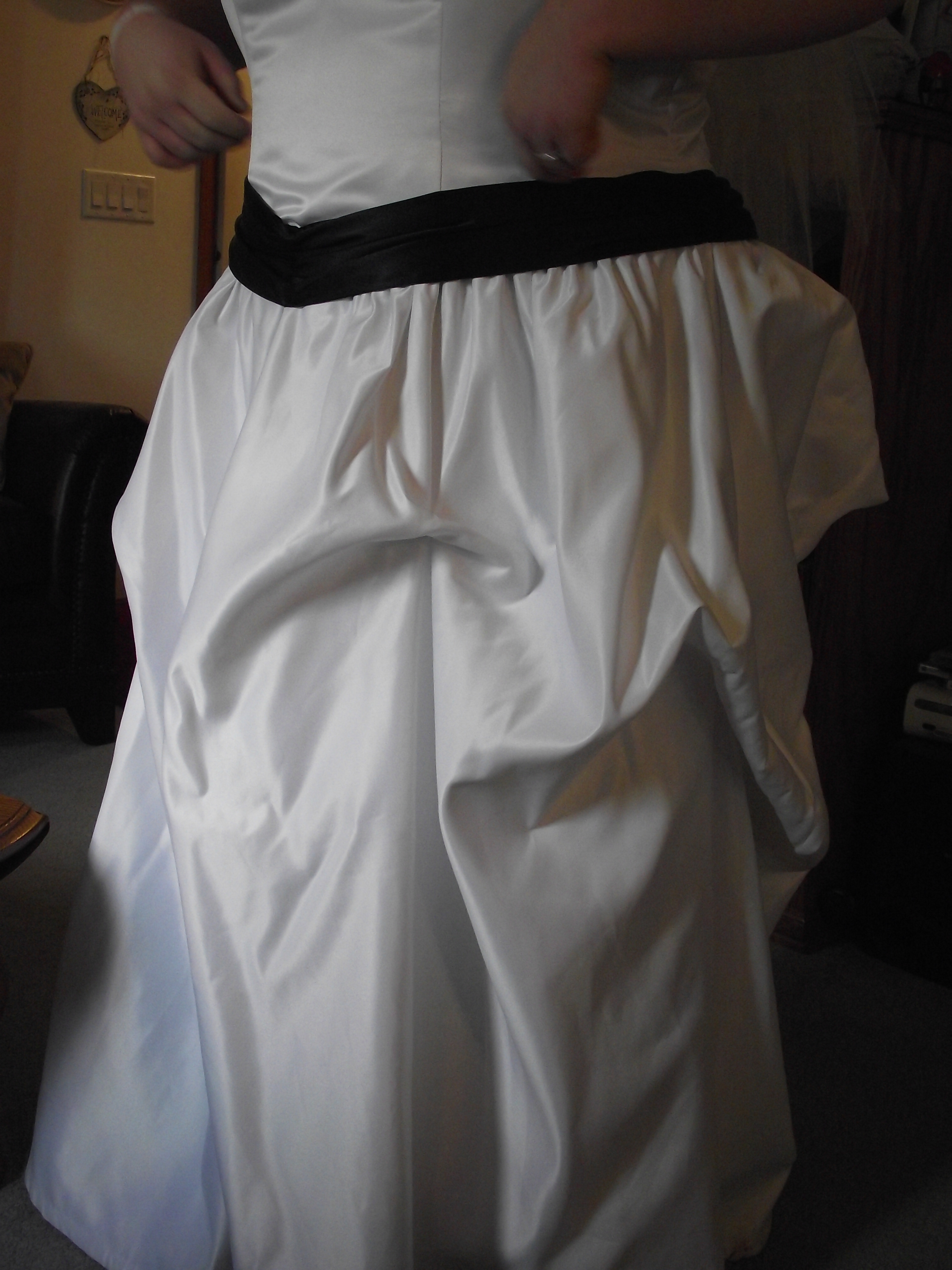 Kendall brought me her mother’s wedding gown from the late 1980’s to remake for her own wedding and a picture of her ‘dream gown’. I altered the shoulders, added a black sash, hemmed the skirt, and added black beads to the bodice. She loved the transformation!